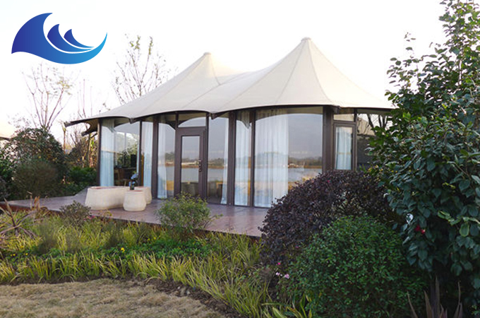 帳篷酒店采用高強度中空鋁合金結構或者是鋼結構,表面具備有防腐處理,優選膜結構頂棚,安全耐用,防水、阻燃、防紫外線。